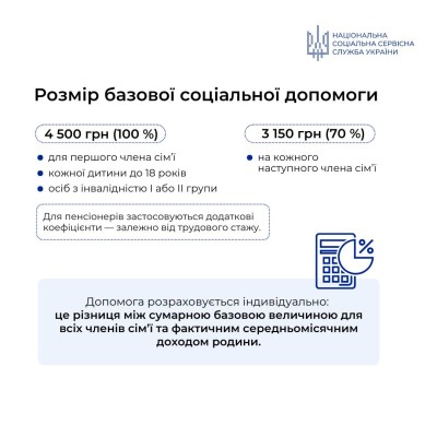 Розмір допомоги визначатиметься з урахуванням базової величини – розрахункової суми, яка встановлює мінімально необхідний дохід на одну особу в родині. У кожному випадку сума допомоги залежатиме від складу сім’ї та її сукупного доходу.