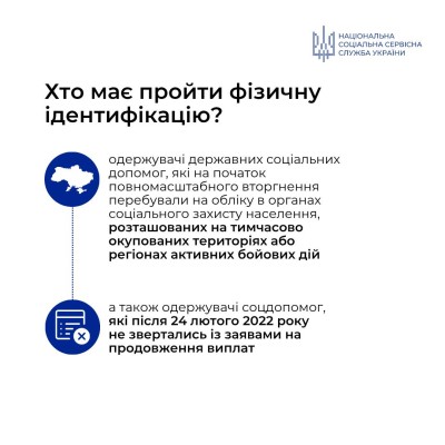 Здійснити фізичну ідентифікацію мають одержувачі державних соціальних допомог, які на початок повномасштабного вторгнення перебували на обліку в органах соціального захисту населення, розташованих на тимчасово окупованих територіях або регіонах активних бойових дій, та після 24 лютого 2022 року не звертались із заявами про продовження виплати на інших територіях.