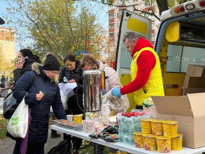 На місці працює польова кухня, доступні гарячі напої та базова підтримка для мешканців.