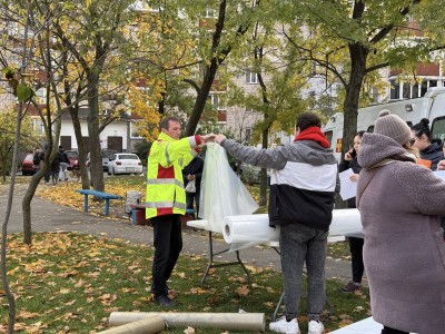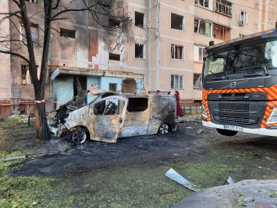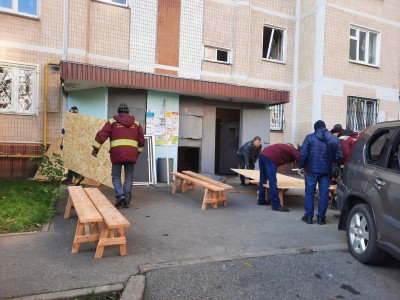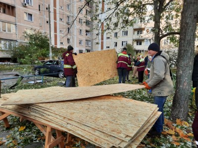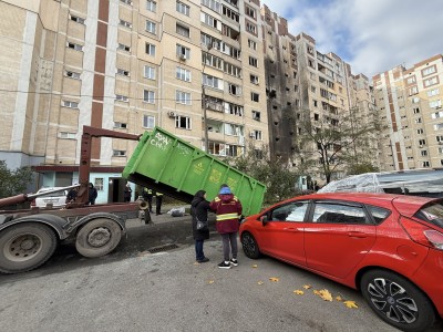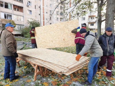 У Деснянському районі тривають роботи з ліквідації наслідків ворожого обстрілу Києва. Комунальні служби району працюють у посиленому режимі: зашивають пошкоджені вікна, прибирають території, вивозять уламки, виконують відновлювальні роботи.