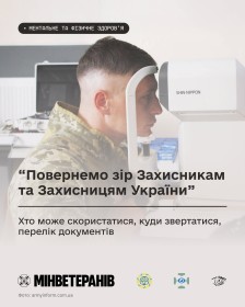 Безоплатна діагностика, заміна кришталика, лазерна корекція, пластичне й оперативне втручання — ці та інші безоплатні послуги з лікування зору доступні для ветеранів та ветеранок у межах проєкту «Повернемо зір Захисникам та Захисницям України».