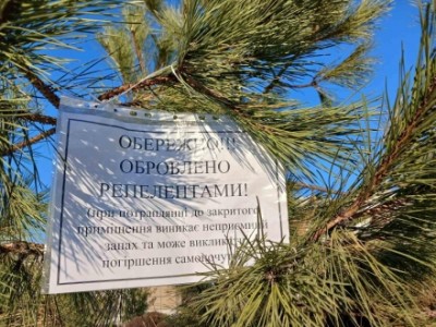 Вічнозелені ялинки-красуні у парках та скверах, на вулицях району обробляються спеціальними препаратами, про що попереджають встановлені таблички.
