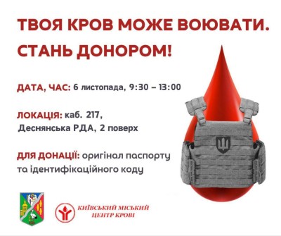 Запрошуємо всіх охочих мешканців Деснянського району долучитися до Дня донора, який буде проходити в нашому районі.