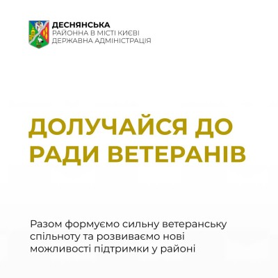 Приєднуйся до Ради ветеранів! Твій досвід і знання – наша спільна сила. Разом ми формуємо активну ветеранську спільноту Деснянського району, щоб підтримувати побратимів, розвивати програми для ветеранів і їхніх родин.