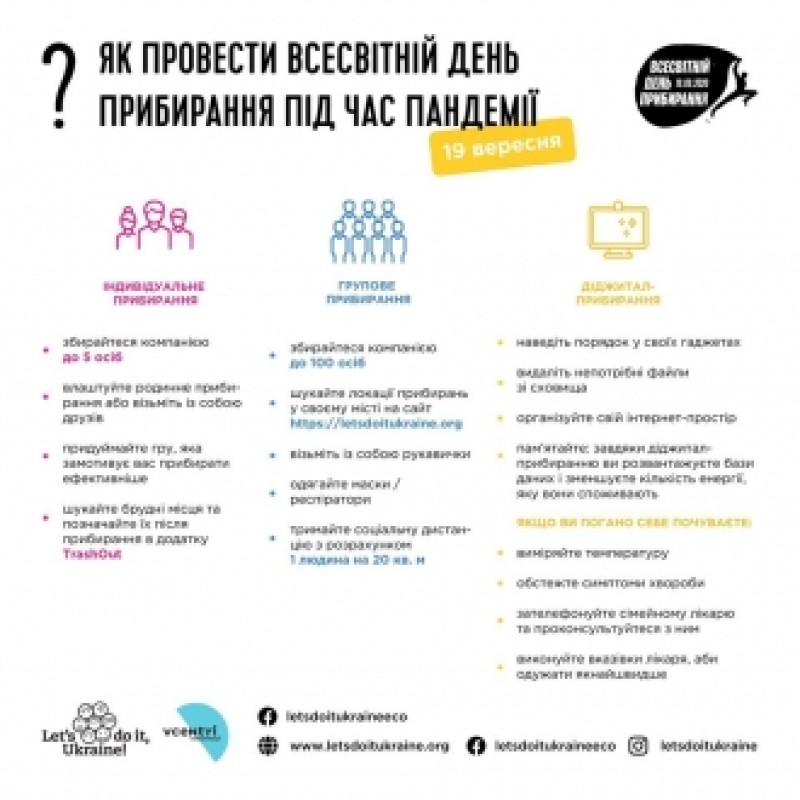 Інфографіку, як провести Всесвітній день прибирання під час пандемії, для вас підготували «Let’s do it, Ukraine» та КП «Центр комунікації та інформації».
