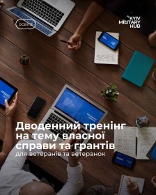 Команда проєкта "Айболить" за інформаційної підтримки Київ Мілітарі Хаб запрошує ветеранів та ветеранок на тренінг "Як розпочати власну справу та підготувати бізнес план для отримання гранту"