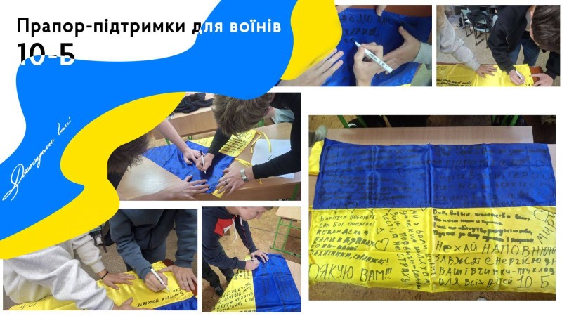 Юні старшокласники передають стяг з побажаннями прямісінько на фронт