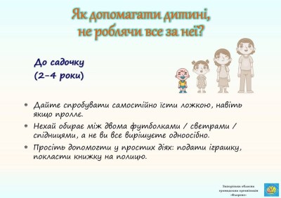 Поставте навідні питання, розбийте велику проблему на маленькі кроки, або покажіть, як почати. Важливо, щоб фінальне зусилля і відчуття успіху належало самій дитині.