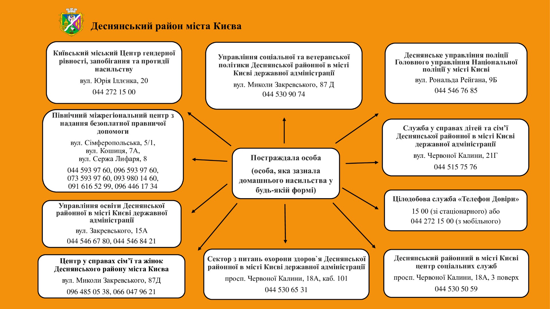 - Центр у справах сім’ї та жінок Деснянського району міста Києва, вул. Закревського, 87-Д, тел.: 096-485-05-38, 066-047-96-21;